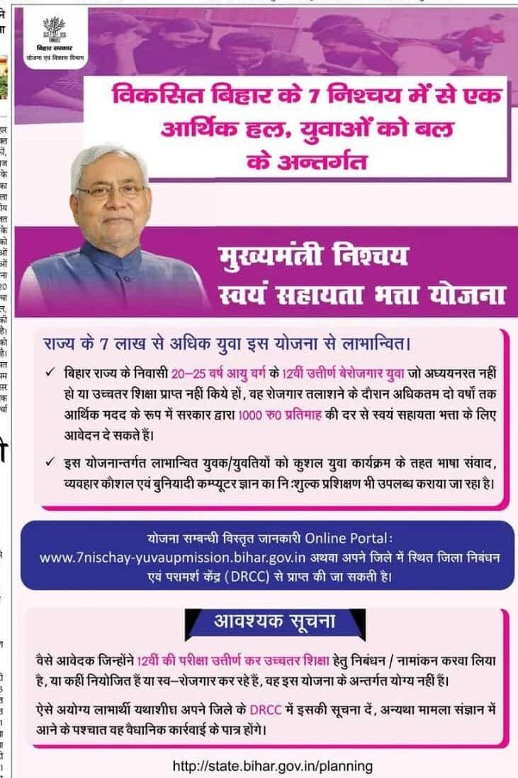| Scheme Name | मुख्यमंत्री निश्चय स्वयं सहायता भत्ता योजना/ बेरोजगारी भत्ता योजना |