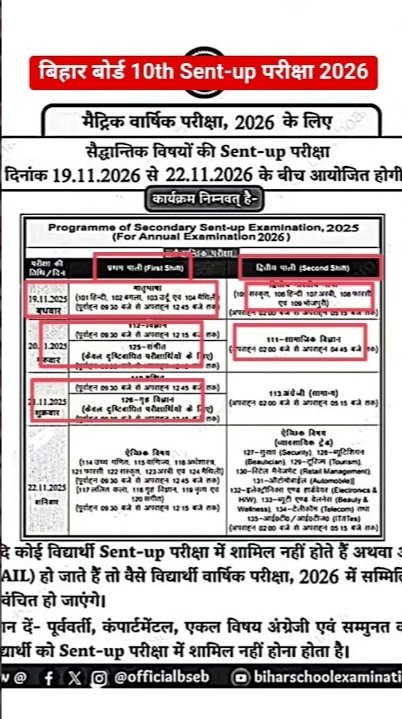 | Bihar Board 10th Sent-Up Exam Dates | 19 November to 22 November 2025 |