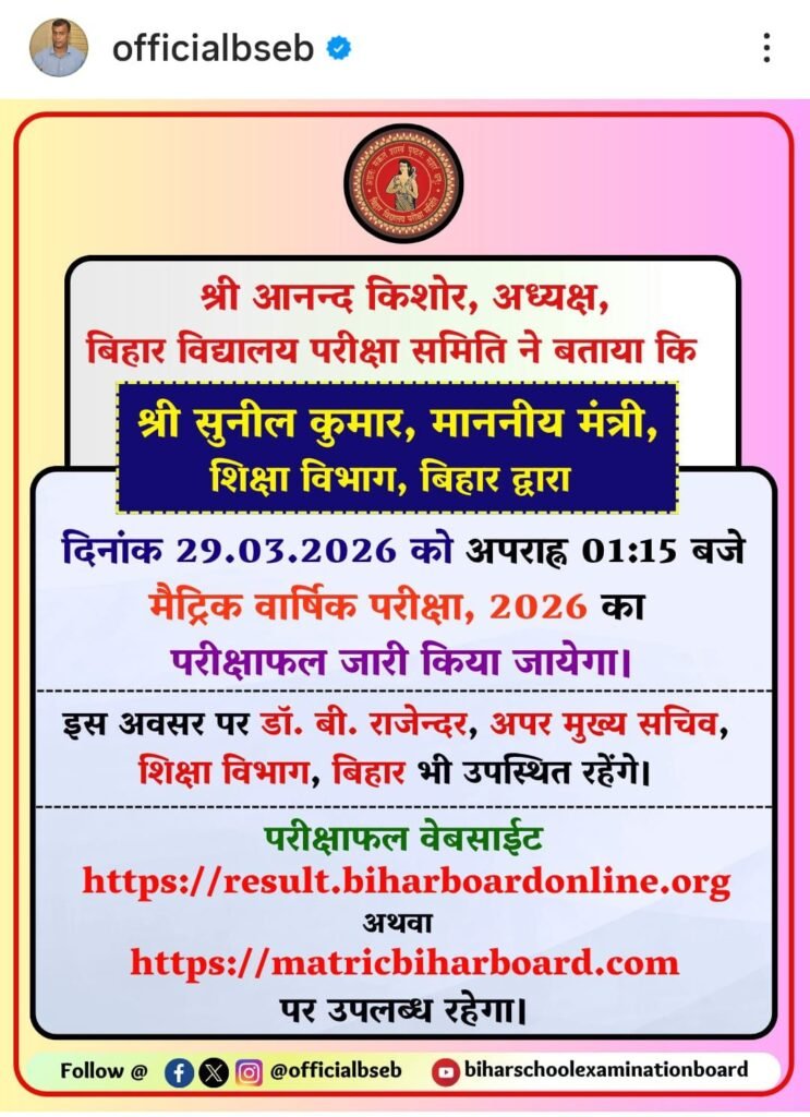 - Bihar Board 10th Result 2026 ऑनलाइन के माध्यम से चेक और डाउनलोड करने के लिए बिहार बोर्ड के ऑफिसियल वेबसाइट पर चले जाना है.