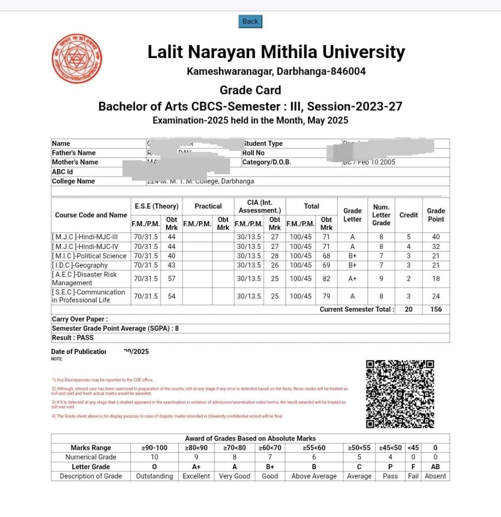 | Post Category | LNMU UG Semester 3 Result 2023-27 | ||||||||