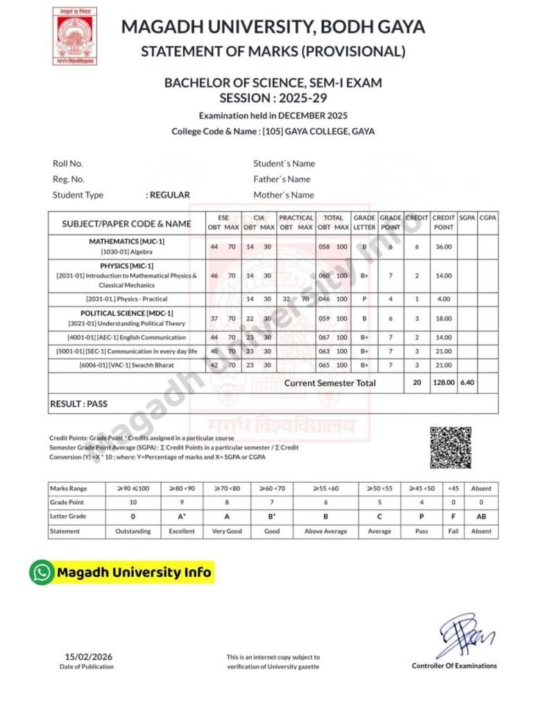 Magadh University UG 1st Semester Result 2025-29 :फाइनली मगध विश्वविद्यालय द्वारा बीए बीएससी बीकॉम सेमेस्टर वन सेशन 2025- 29 का रिजल्ट ऑनलाइन के माध्यम से दिनांक 23 फरवरी 2026 को जारी कर दिया गया है।