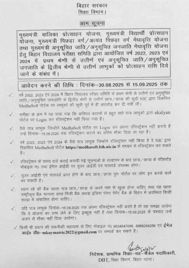 Matric Inter Pass Scholarship Online Apply 2025 – जितने भी विद्यार्थी मैट्रिक इंटर पास 2022 या फिर तो 2023 इसके साथ-साथ द्वारा 2024 में किए थे उन लोगों का ऑनलाइन अप्लाई डेट जारी कर दिया गया है जो की अप्लाई डेट आप लोग का 30 अगस्त 2025 है और इसका अंतिम तिथि 15 सितंबर2025 है।