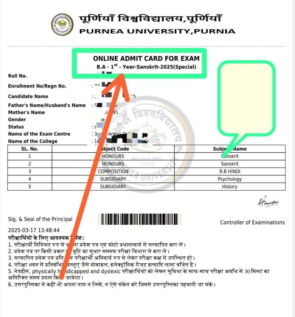 Purnea University Part 1 Special Admit Card 2025 Summary