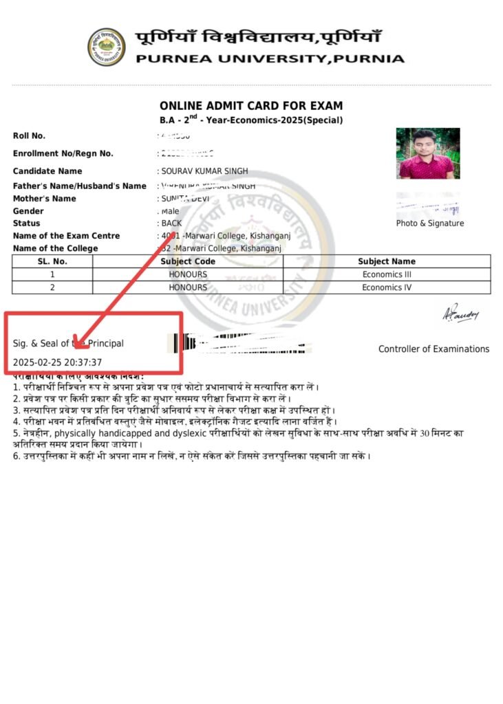 Post NamePurnea University Part 2 Special Exam Admit Card 2025