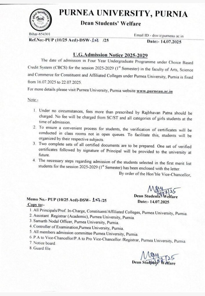 Purnea University UG 1st Merit List 2025-29 : पूर्णिया यूनिवर्सिटी ग्रेजुएशन प्रथम सेमेस्टर मेरिट लिस्ट सत्र 2025-29 का इस दिन जारी?