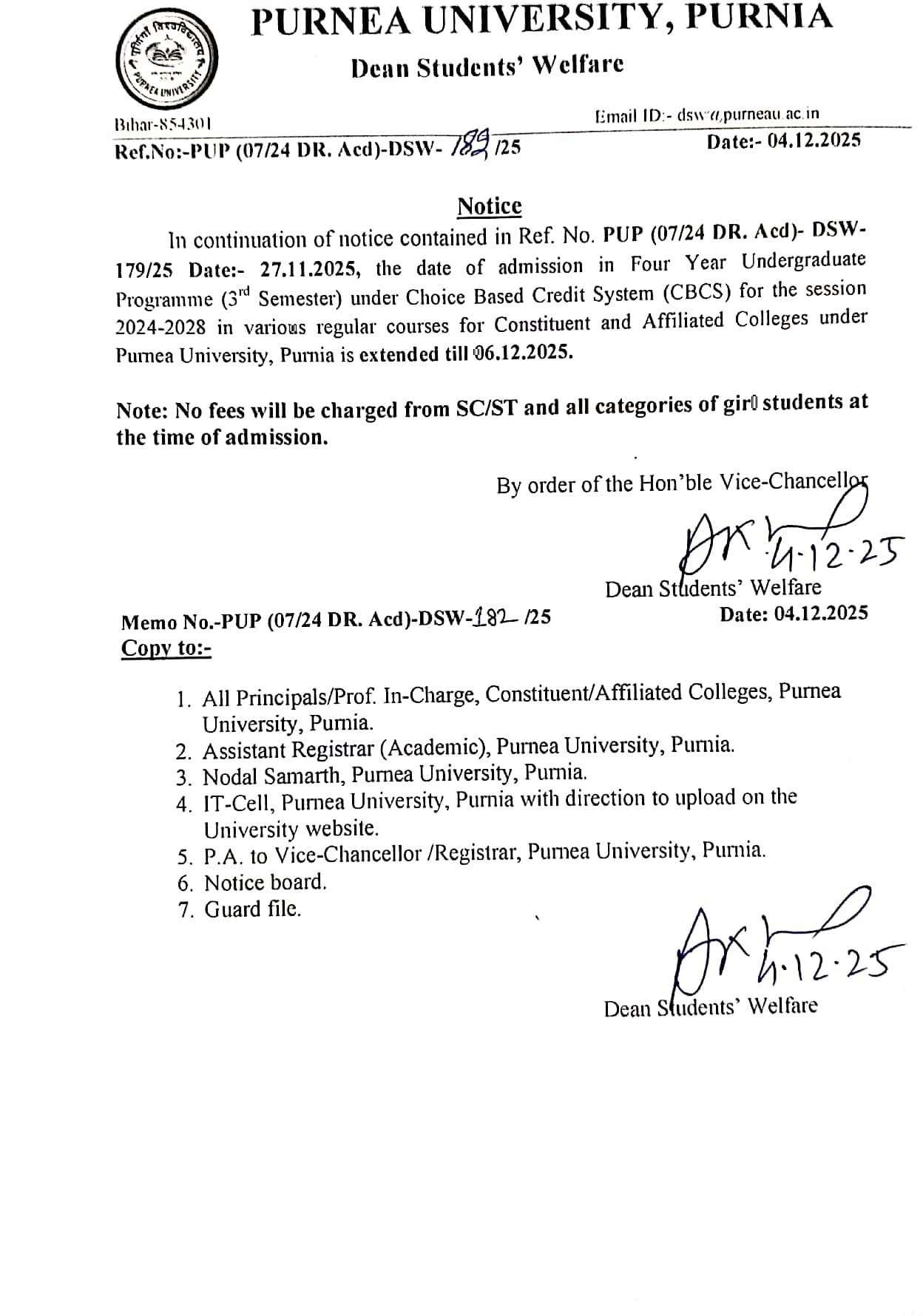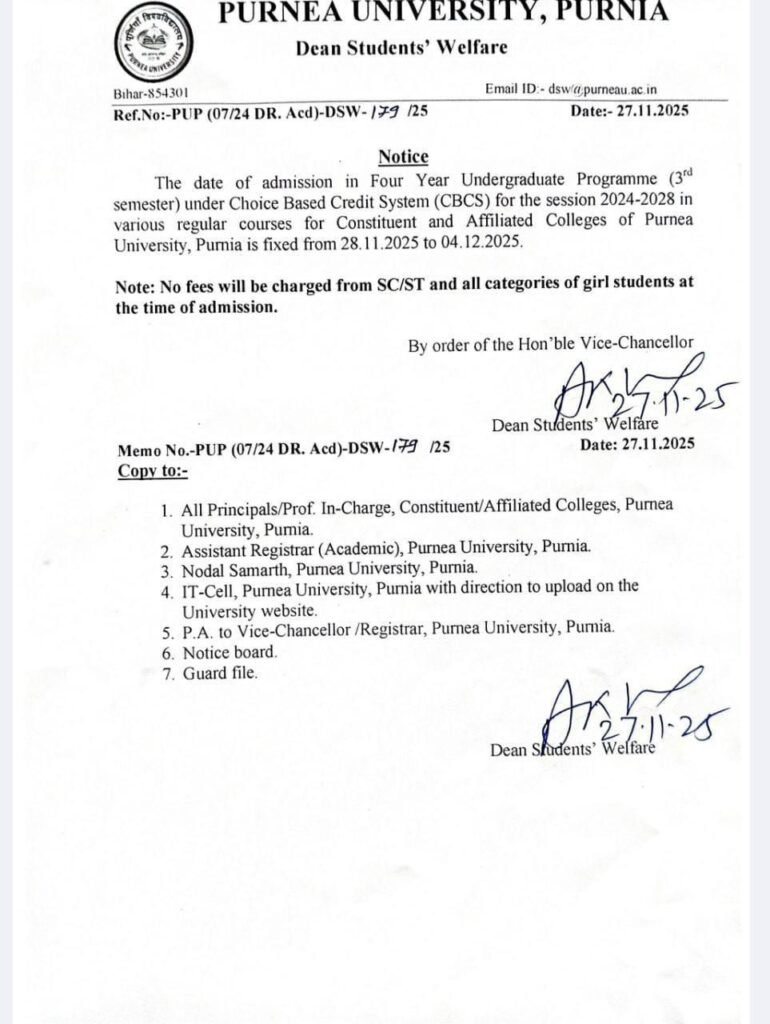| Purnea University UG 3rd Semester Admission 2024-28 Extended Notice | Click Here |