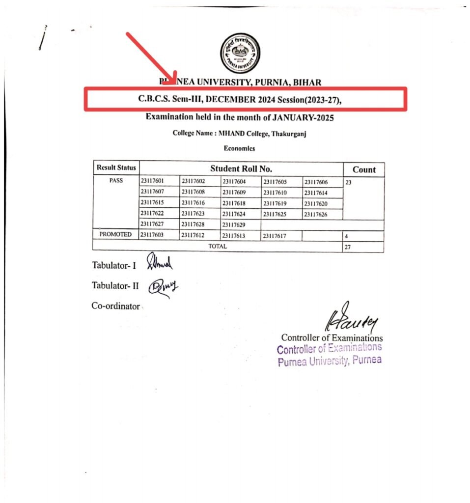 Purnea University UG 3rd Semester Result 2025 Summary