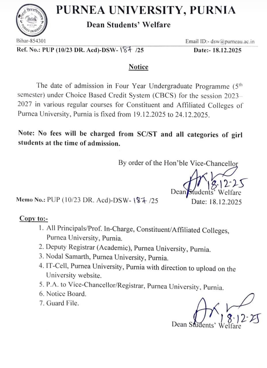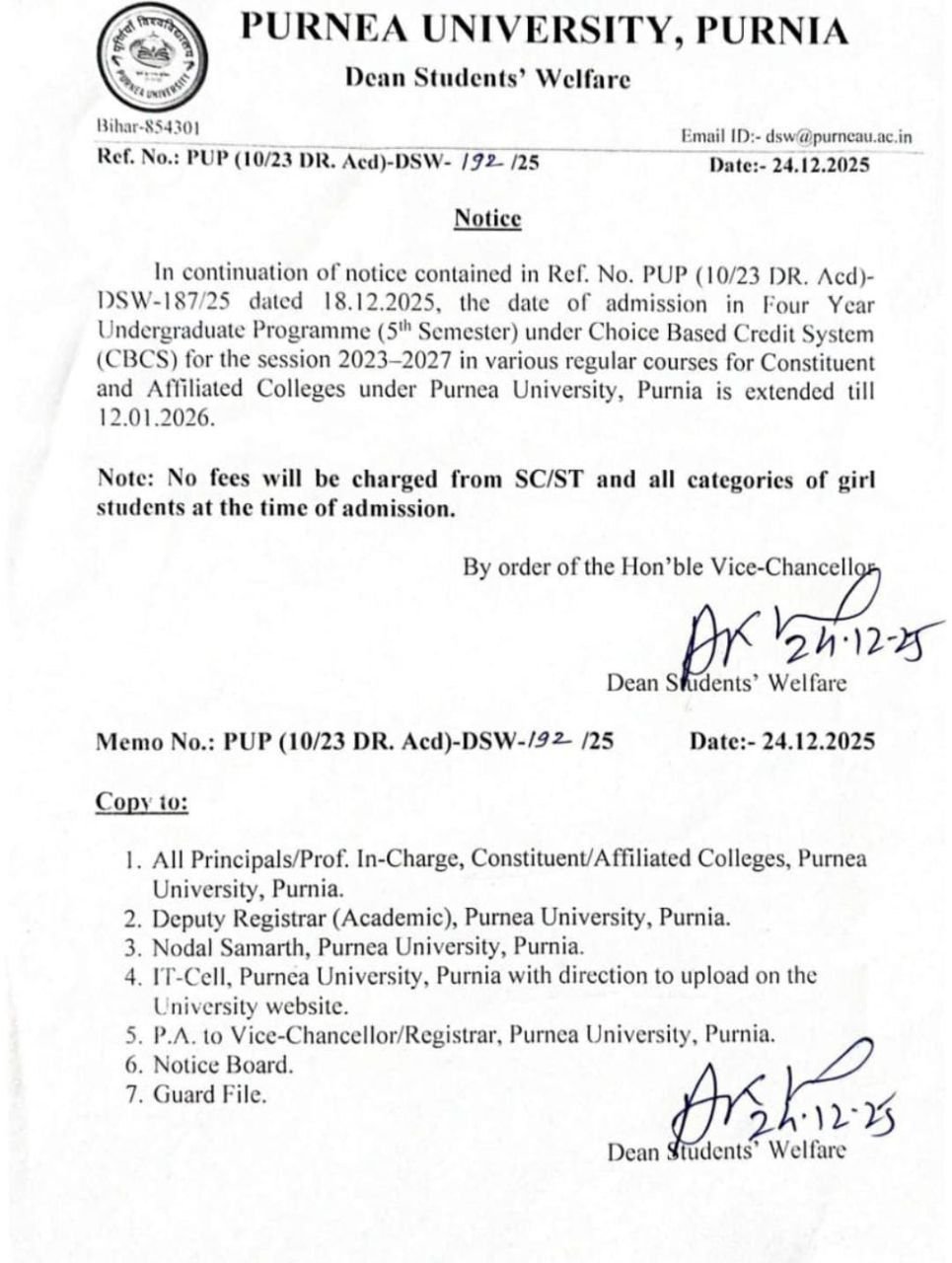 Purnea University UG 5th Semester Admission 2023-27 :फाइनली पूर्णिया विश्वविद्यालय द्वारा बीए बीएससी बीकॉम सेमेस्टर 5 सेशन 2023 – 27 में नामांकन के लिए ऑफिशल नोटिस जारी कर दी गई है ऑफिशल नोटिस के अनुसार आप लोग का नामांकन 19 दिसंबर 2025 से लेकर की 24 दिसंबर 2025 तक ली जाएगी।
