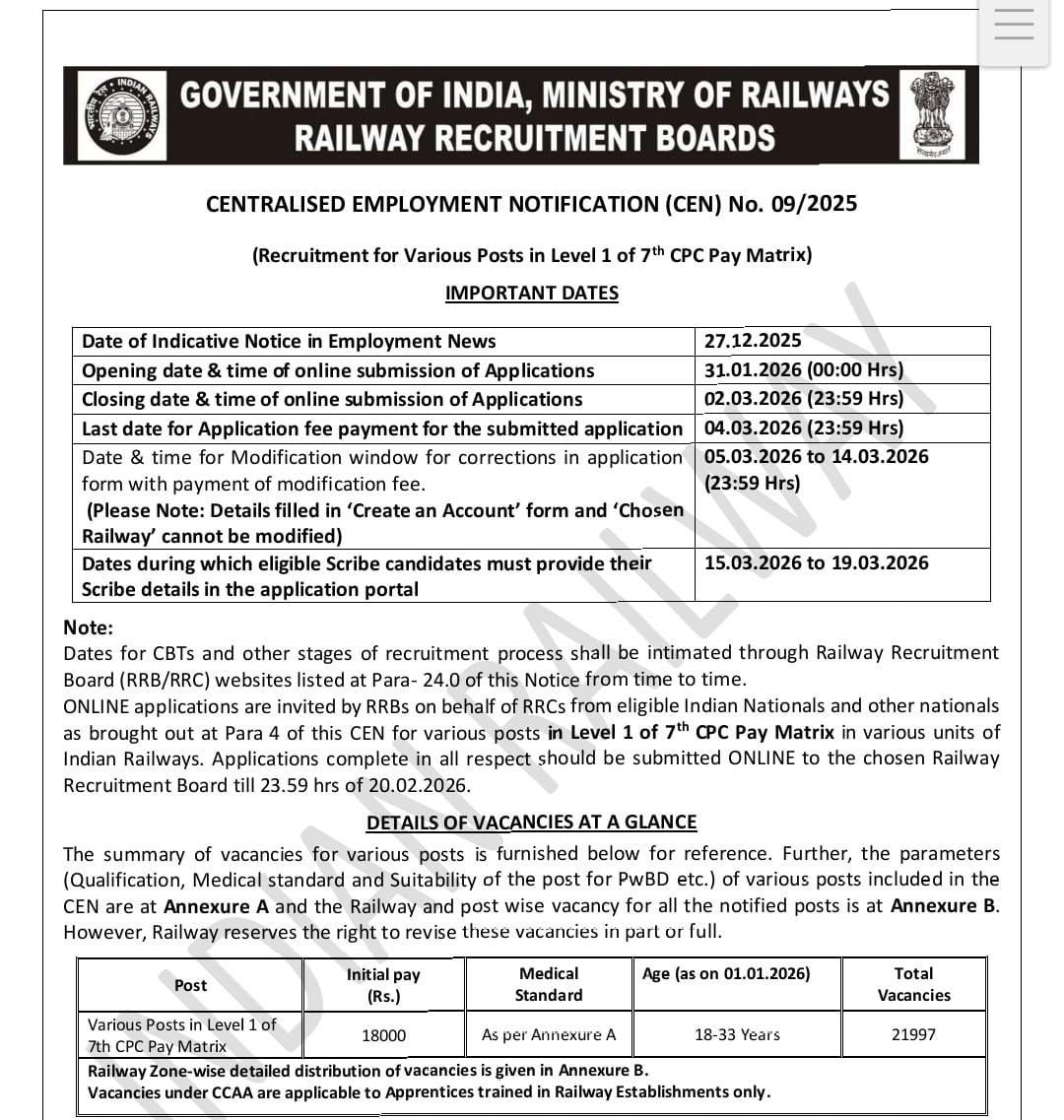 RRB Group D Bharti 2026 : कुल पद 21000 से अधिक ग्रुप डी का होगा बंपर भर्ती!